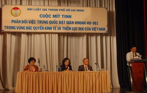 Lời dẫn: Chiều 10-5, tại Nhà Văn hóa Thanh Niên, Hội Luật gia TP.HCM đã tổ chức cuộc mít tinh phản đối việc Trung Quốc đặt giàn khoan trái phép tại Việt Nam. Tham dự cuộc mít tinh có đông đảo người dân TP và nhiều nhân sĩ, trí thức, chức sắc