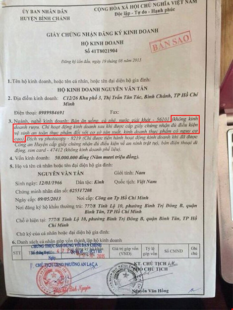 Giấy Chứng nhận Đăng ký kinh doanh do Phòng kinh tế huyện Bình Chánh cấp cho chủ quán "Xin Chào". Phòng Kinh tế yêu cầu chủ quán thực hiện văn bản đã hết hiệu lực khi viết "...kinh doanh thực phẩm có nguy cơ cao". Ảnh từ báo Pháp luật TP Hồ Chí Minh