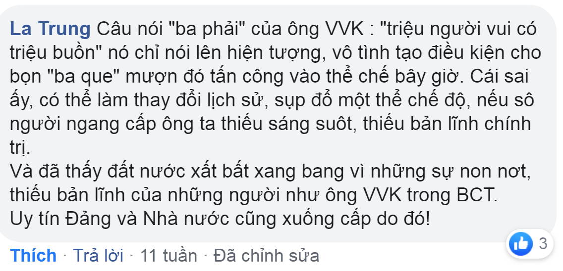 " Vinh Ngo Tôi đã có ý kiến về bài viết của cháu Hoàng Ngân Thương theo hướng phê phán những người lợi dụng phát biểu của cố TTVVK để khấy trong thành đục và khuyên mọi người ngừng tranh luận. Và ko có ý kiến riêng nữa.
